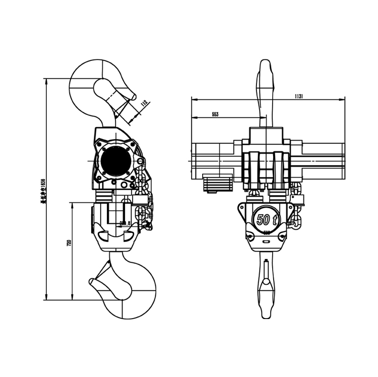 50 ton mining pneumatic hoist, working pressure: 0.63Mpa, number of chains: 4, motor output power: 6.3KW, standard lifting height is 3 meters, and the lifting stroke can be customized to be extended. Full load lifting speed: 0.7M/MIN, chain size: 22*66MM. Gaston pneumatic hoist has 6 patents, each of which is an advantage of our pneumatic hoist design; overload clutch, the hoist automatically slips and stops lifting when the rated weight is reached; the surface of the main components of the pneumatic motor is treated with anti-rust treatment, which is not easy to cause rust on the main components of the pneumatic motor and cause the motor to get stuck and not rotate; the shell is cast with high-strength material with large bearing capacity; the air control valve is designed with a large-diameter channel, and the large enough ventilation volume ensures the lifting efficiency of the pneumatic hoist; the brake assembly adopts an internal spline anti-skid design to ensure that the pneumatic hoist brake pad will not cause the hoist chain to automatically slide down due to slipping; the upper and lower hooks are made of forging technology, and the hooks are tempered and heat treated to increase the toughness of the hooks, making them not easy to wear and durable; the deceleration part adopts a closed design, and the interior can be guaranteed to be oil-free for a long time, and the internal channel design of the card device can reduce the heat generated by the friction of the reducer. The greater advantage is that it reduces the noise generated by the exhaust of the pneumatic motor.